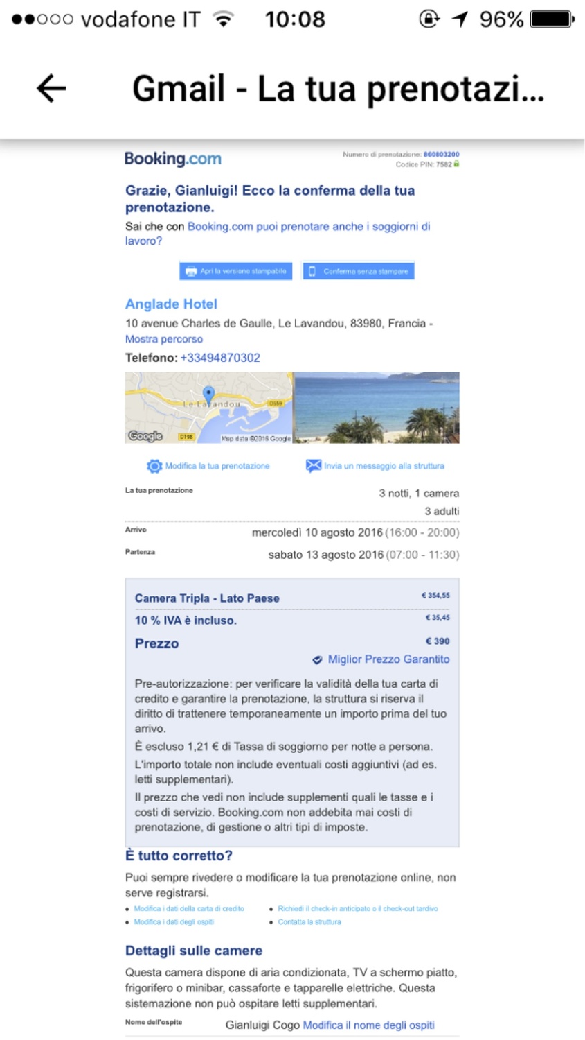 e poi osservate come la vede Gmail per catturare i dati di Booking.com nella sua applicazione