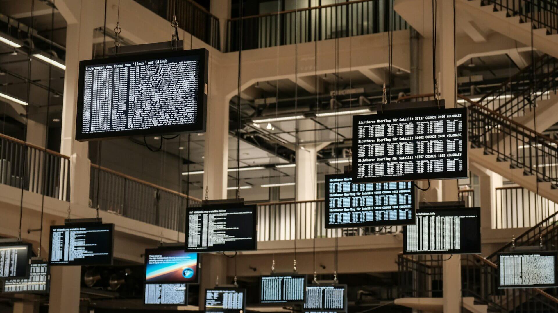Foto di Leif Christoph Gottwald su Unsplash- https://unsplash.com/it/foto/un-mucchio-di-schermi-televisivi-appesi-al-soffitto-iM8dxccK1sY