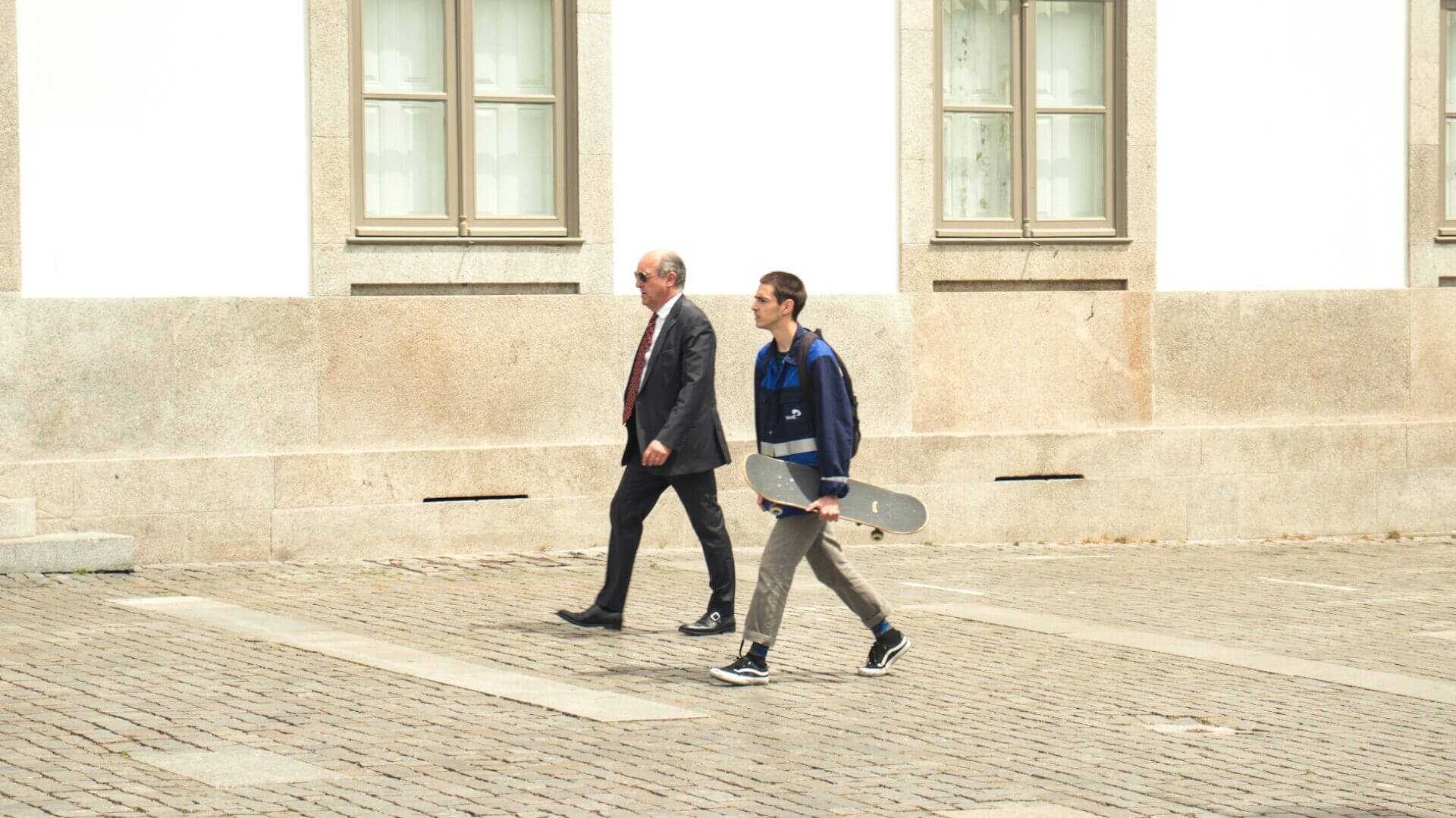Foto di Benjamin Ranger su Unsplash - https://unsplash.com/it/foto/due-uomini-che-camminano-accanto-a-un-edificio-in-cemento-bianco-F2TdtctaxdQ
