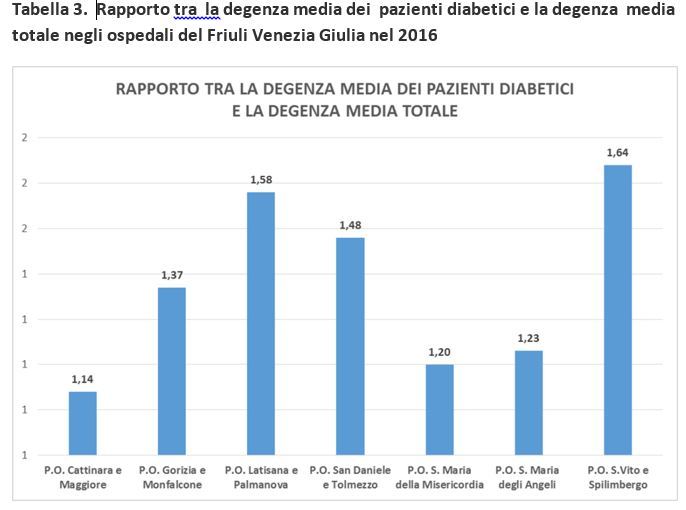 Sono stati definiti una serie di indicatori. Uno di questi indicatori misura in ciascun ospedale la durata della degenza dei ricoveri dei pazienti diabetici rapportata con la durata della degenza complessiva di tutti i ricoveri. La tabella 3 riporta la distribuzione tra gli ospedali regionali di tale indicatore. Emerge come i risultati dell’ospedale di Trieste, dove esiste già un’organizzazione specifica, configurino la best practice regionale e siano già competitivi rispetto a dati esistenti in letteratura.