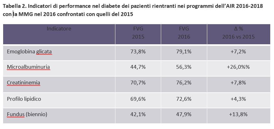La tabella 2 riporta i risultati di copertura dei singoli esami ottenuti nel 2016 paragonati con quelli del 2015. Sono stati esclusi dall’analisi i pazienti che non avevano ancora fornito il proprio consenso al trattamento, le pazienti con diabete in gravidanza, e i pazienti che per ragioni varie non erano stati seguiti dal proprio medico per l’intera durata dei programmi.
